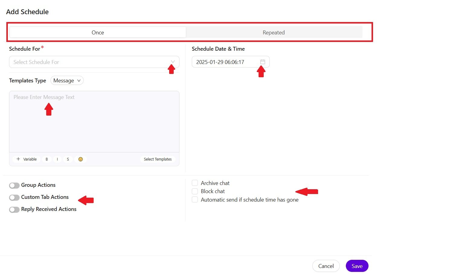 - Choose Message Type: Select from pre-defined templates or compose custom messages.